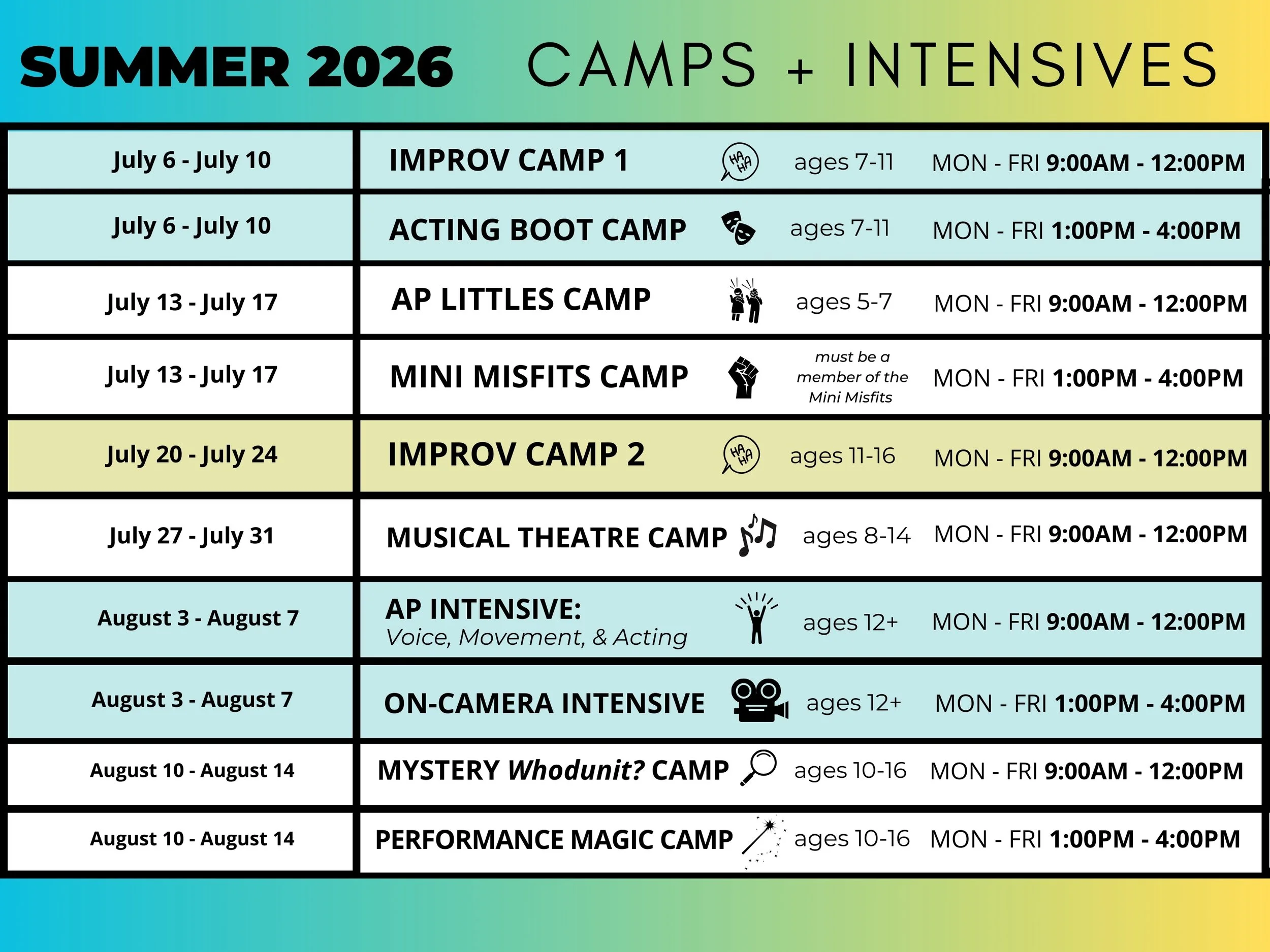 Week long camps/intensives meet Monday-Friday of set week